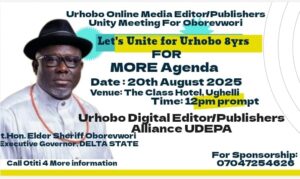 The Urhobo Digital Editors and Publishers Alliance (UDEPA) has announced plans to hold a crucial and unifying meeting in honour of the Governor of Delta State, Rt. Hon. Elder Sheriff Oborevwori, as we all are seeking for his re- election of his completion on his constitutionally mandated eight years in office.